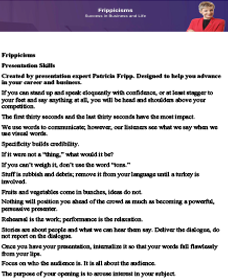 Receive free, on-going Fripp webinar invitations, sales and presentation skills information, and special discounts from Executive Speech Coach, Sales Presentation Trainer, and Professional Keynote Speaker, Patricia Fripp, CSP, CPAE. As an added bonus, sign up now and receive a free copy of Patricia Fripp’s How to Present and Teach in the Virtual World.